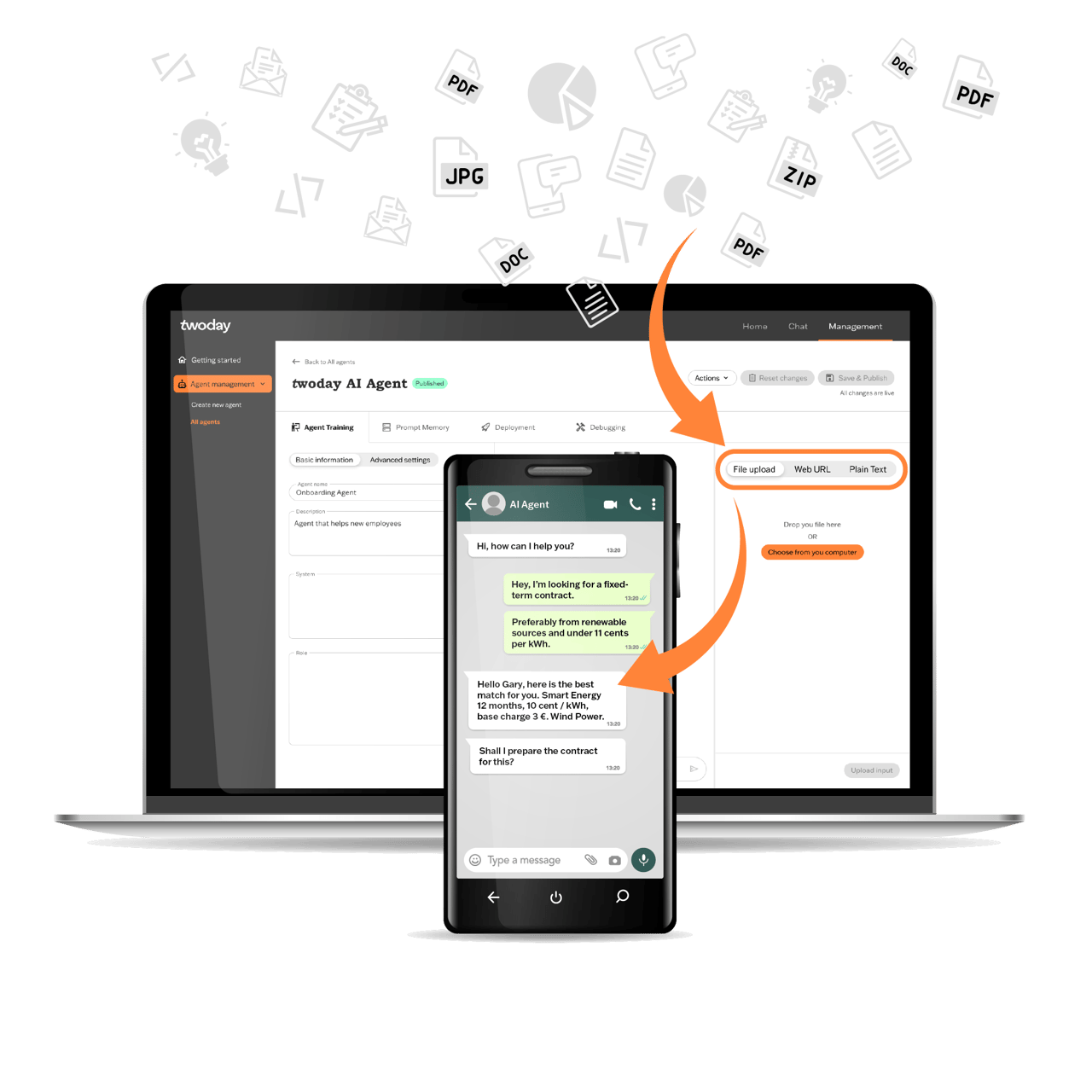 - twoday AI Agent kan tränas för att lära sig olika typer av information för alla ändamål, oavsett om det är från företagets interna databaser eller externa källor. Tjänsten är i full överensstämmelse med GDPR och andra dataskyddsbestämmelser.